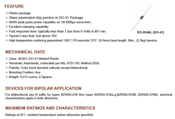 BZW04 SERIES引線型瞬態抑制二級管產品詳情