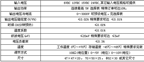 (2)調節端(白線)與負極(黑線)之間接入10KΩ精密交圈電位器或接入0~5V、0~10V直接電壓,可線性調節輸出電壓在規定范圍內變化。