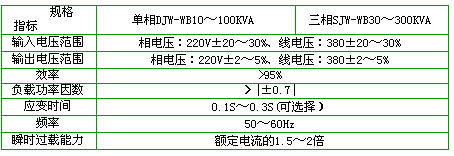 DJW-WB、SJW-WB單、三相系列微電腦無觸點補償工穩壓器,它集先進的組合繞組被償方式和無觸點開關、微機控制交流穩壓技術于一體,具有高效節能、調節快速、三相自動平衡、無機械故障和炭刷磨損,并具有延時、過、欠壓報警和保護等功能。