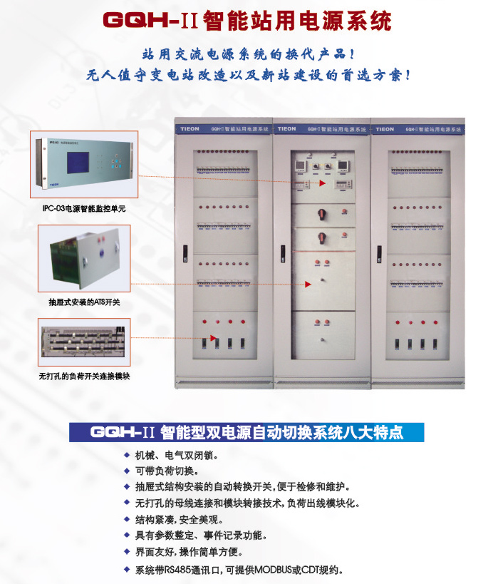 GQH智能站用交流電源系統是我司針對變電站的要求和特點,專為變電站研發的智能型站用交流電源系統,采用ATS(Automatic Transfer Switch)自動轉換開關和智能監測及控制技術,不僅實現了機械、電氣雙閉鎖,從根本上保證了電源的安全可靠切換,還實現了全智能的監測、控制模式,具有通信接口,支持多種協議,可方便地接入變電站綜自系統。