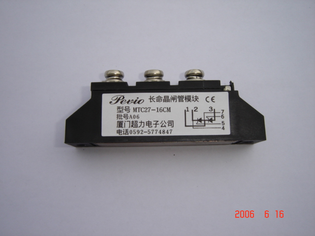模塊內含有二個晶閘管芯;通用電連接型式,代號為C,見下圖。1、2、3為功率端,配有不銹鋼螺釘,可作為一個整流臂,用于直流電路;也可把2、3短接成一個端,1為另一端,構成“反并聯”連接,用于交流電路。5、6端分別為對應的晶閘管的門極控制端,可用電線錫焊后引出。