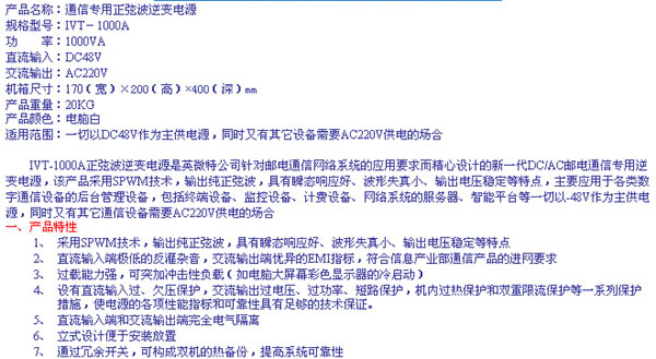 通信專用正弦波逆變電源IVT-1000A產品詳情