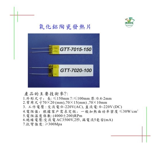 產品的主要技術參數:1、外形尺寸:長: ≤150mm 寛:≤100mm 厚: 0.4-2mm ;2、常用尺寸70×20 (mm),70×15(mm) ,70×10mm ;3、工作電壓 : 交流電:0~220V(AC), 直流電: 0~220V (DC) ;4、 電阻值:根據客戶需求定做,一般加熱面功率密度 ≤30W/cm2 ;5、電阻溫度系數: (4000±200)RPm ;6、絕緣電壓:交流電 AC3500V,2秒, 漏電流5毫安(mA) ;7、抗彎強度: ≥300Mpa 。