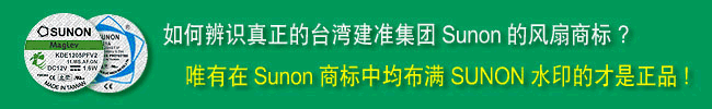 如何確保您手中的Sunon風扇,是來自臺灣建準集團的正品呢?為確?蛻魴嘁,讓每位客戶都能享有臺灣建準集團Sunon風扇高品質的服務,本公司所出品的每一顆風扇商標,均布滿經特殊處理之SUNON水印,以區隔市場上流通之類似商品。