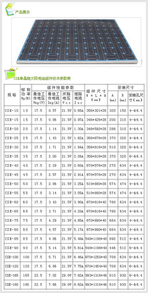 主要經營的產品有太陽能路燈、太陽能庭院燈、太陽能殺蟲燈、太陽能草坪燈、LED燈源、太陽能跟蹤系統、控制器(路燈、系統)、逆變器(正弦波、修正波)、便攜電源(分體式、一體式、戶用型)、太陽能電池組件(單晶、多晶)、太陽能紅綠燈、太陽能黃閃燈、太陽能指示牌、太陽能道釘等太陽能路政標志;我公司主要做燈具安裝、光伏發電系統集成等工程。如需更加詳細的了解公司產品詳情及公司的情況請登陸我公司官方網站:www.csenet.com www.csenet.cn 。