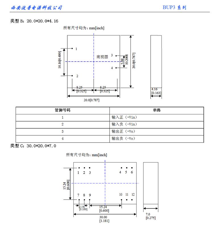 外形尺寸:18.5ⅹ12.0ⅹ8.0/20.0ⅹ20ⅹ4.16/30.0*20.0*7.0(mm) 4:1輸入電壓范圍,單、雙路輸出 典型效率(5v)82% 500kHz開關頻率