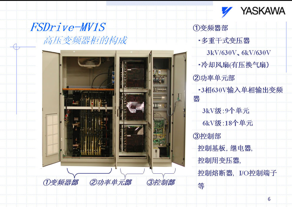 高壓變頻器的概要是日本國內的標準高圧變頻器,采用「電源無干擾」,「機械無振動」的多級串聯形PWM方式。安川電機在日本是第一家使用這種方式的公司,從96年開發至今其業績已經達到400余臺。安川高壓變頻器采用了最新技術,比以往的更進一步。更人性化更便于使用增強無PG 矢量控制增強瞬停功能使用數字操作器和通用變頻器相同類型的操作界面。