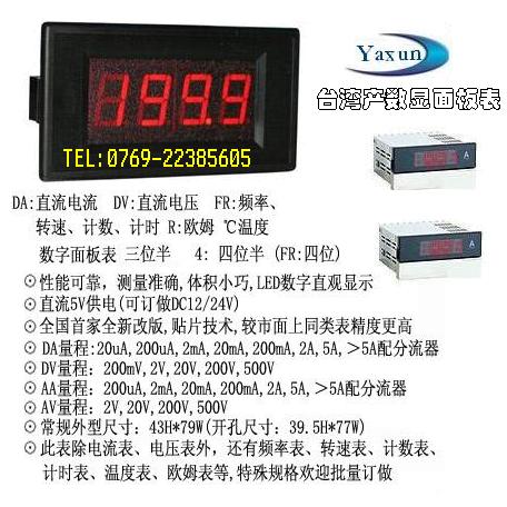 數顯表頭(數字面板表)為三位半顯示,規格:43*79 黑色,有直流電壓表頭、交流電壓表頭、直流電流表頭、交流電流表頭.該表具有性能可靠,測量準確,體積小巧,LED數字顯示等特點。技術參數如下: