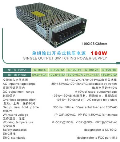 開關電源(單組電壓輸出)S-100-5(輸出電壓5V,20A);S-100-12(輸出電壓12V,8.3A);S-100-24(輸出電壓24V,4.2A)。