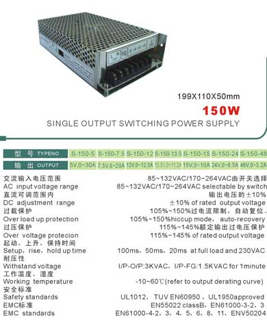 開關電源(單組電壓輸出)S-150-5(輸出電壓5V,30A);S-150-12(輸出電壓12V,12.5A);S-150-24(輸出電壓24V,6.5A)。
