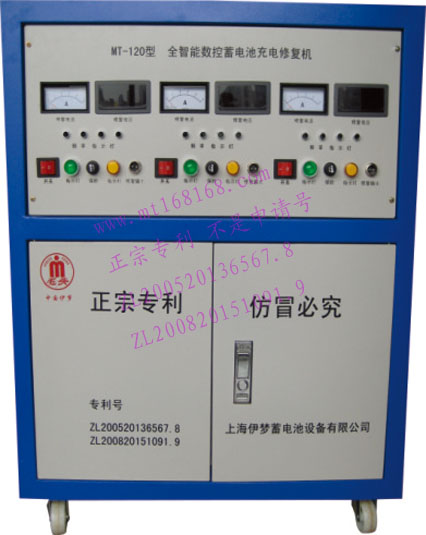 通用型統一價:7800元外形體積:750×600×300mm MT-120全智能數控蓄電池大型充電修復機豪華數碼顯示,全自動檢測修復電流、電壓頻率顯示,傻瓜式輸出,接反自動保護,采用多項專利技術生產,主要配件德國、美國進口,同時可修復電動車、電摩、摩托車、照明燈等1-30Ah電池修復數量20塊(電源50Hz交流200V,空載功率50W)