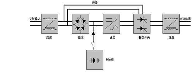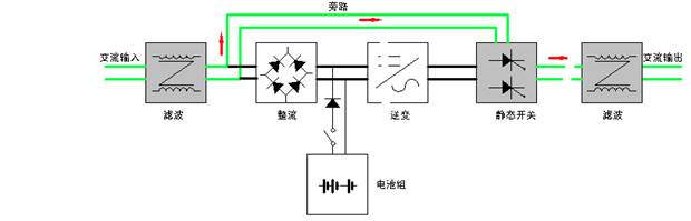 A.逆變系統工作于旁路狀態時各部份電路工作原理:市電進入經EMI濾波器濾除市電端送來的雜訊干擾后,由靜態開關送出后經輸出EMI濾波器濾除干擾后送到用戶負載端,為用戶負載提供電能。機器此時的輸出只是經過濾波后而無穩壓、穩頻處理過程的普通市電。
