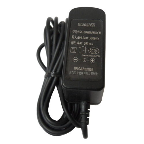 產品規格1. 尺寸:59x26x44mm2. 重量:81克3. 輸入:交流100-240V 4. 輸出:直流8.4V 500mA5. 線材:1.2m6. 插腳:3C/CE/UL/UK7. 插頭:Ø3.5*1.358. 包裝:中性更多產品規格型號,歡迎來電咨詢!