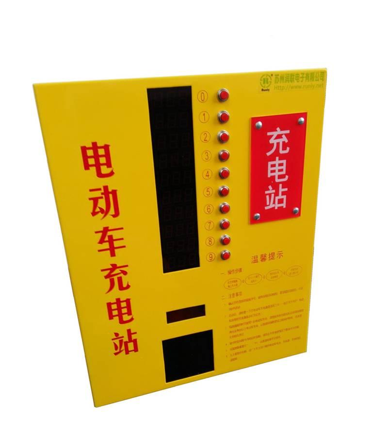 --電動電瓶車充電站產品由1臺機箱主控制器外加十個2孔插座構成,內裝有電表及空氣開關,設備有十路供電通道,機箱外殼上每路通道都有其獨自的顯示窗口與控制按鍵。用戶刷卡后按下其中的一個按鍵,控制器就會給對應通道的插座供電,各通道的工作狀態與工作時間,可以通過其對應的顯示窗口顯示出來。考慮為適應不同型號車,充電時還是需要插接上自帶的充電器。