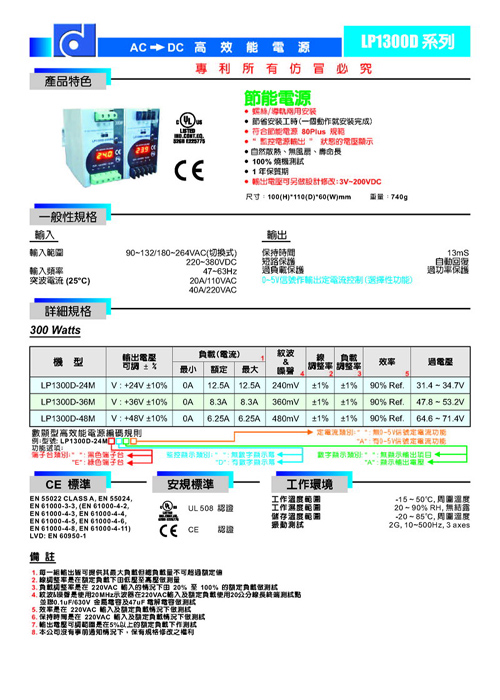 LP1300D-24MDA,24V12.5A數顯導軌式開關電源性能參數