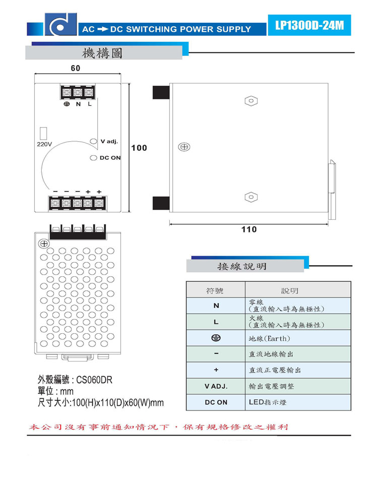 LP1300D-24MDA,24V12.5A數顯導軌式開關電源結構參數: