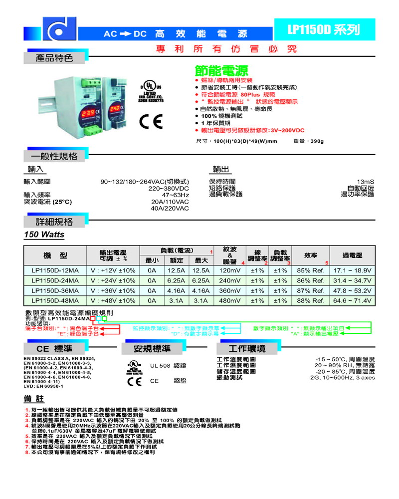 品牌:昂鼎-偉達源 型號:LP1150D-24MADA,24V6.25A數顯導軌式開關電源