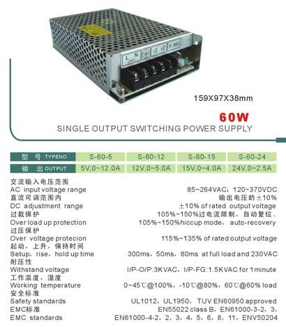 開關電源(單組電壓輸出)S-60-5(輸出電壓5V,12A);S-60-12(輸出電壓12V,5A);S-60-24(輸出電壓24V,2.5A)。