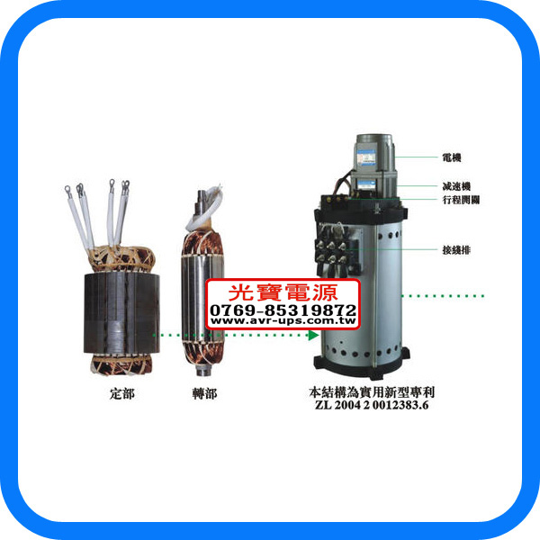 光寶感應(yīng)式自動電源穩(wěn)壓器即解決此問題而設(shè)計,提供您穩(wěn)定、安全、純凈的電源環(huán)境。創(chuàng)新的技術(shù),創(chuàng)新的設(shè)計,依此信念,本公司經(jīng)長期研究,并歸集歐美各國技術(shù),為顧客提供屢獲國內(nèi)外市場佳評的感應(yīng)式穩(wěn)壓器。其主體為感應(yīng)電壓調(diào)整器IVR(無碳刷式調(diào)整器)。原理與變壓器略近,乃定子、轉(zhuǎn)子感應(yīng)方式,調(diào)整相角度,以電磁感應(yīng)原理達到連繼、線性、無觸點式調(diào)整輸出電壓。使用線性比較邏輯電路,檢出輸出電壓自動穩(wěn)定電壓、平衡電壓-----故名為感應(yīng)電子式穩(wěn)壓器。