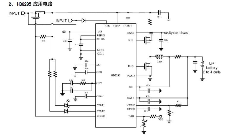 HB6295為開關型2、3、4節鋰離子/鋰聚合物電池充電管理芯片,非常適合于便攜式設備的充電管理應用。HB6295外置功率MOSFET、高精度電壓和電流調節器、預充、充電狀態指示和充電截止等功能于一體,采用QFN-24封裝形式。HB6295對電池充電分為三個階段:預充(Pre-charge)、恒流(CC/Constant Current)、恒壓(CV/Constant Voltage)過程,恒流充電電流通過外部電阻決定,最大充電電流為4A. HB6295 集成最大輸入電流限制、短路保護,確保充電芯片安全工作.HB6295集成NTC 熱敏電阻接口,可以采集、處理電池的溫度信息,保證充電電池的安全工作.