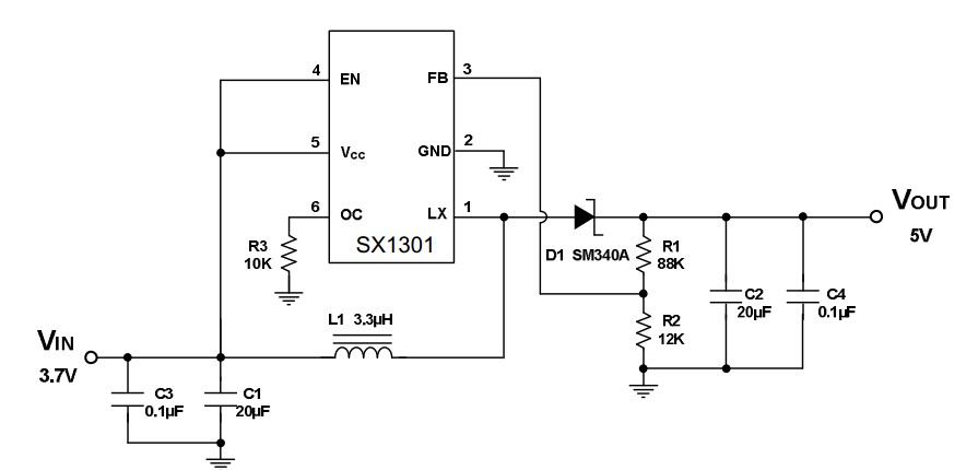 適用于移動電源(5V,1A輸出)應用的小封裝(SOT23-6)升壓IC:SX1301